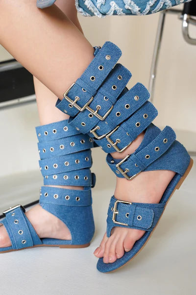 Discover contemporary style with the Denim Belt Buckle Flat Sandals. Featuring a modern denim finish and a multi-buckle design, these sandals offer a modern edge and a secure fit. Enjoy the combination of cutting-edge design and comfort, perfect for casual outings, lunches, or leisurely strolls.