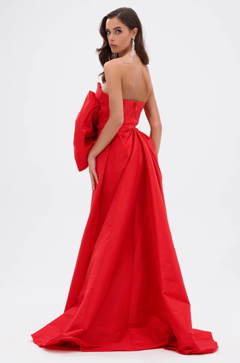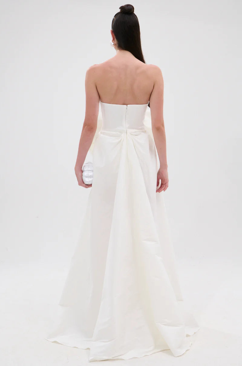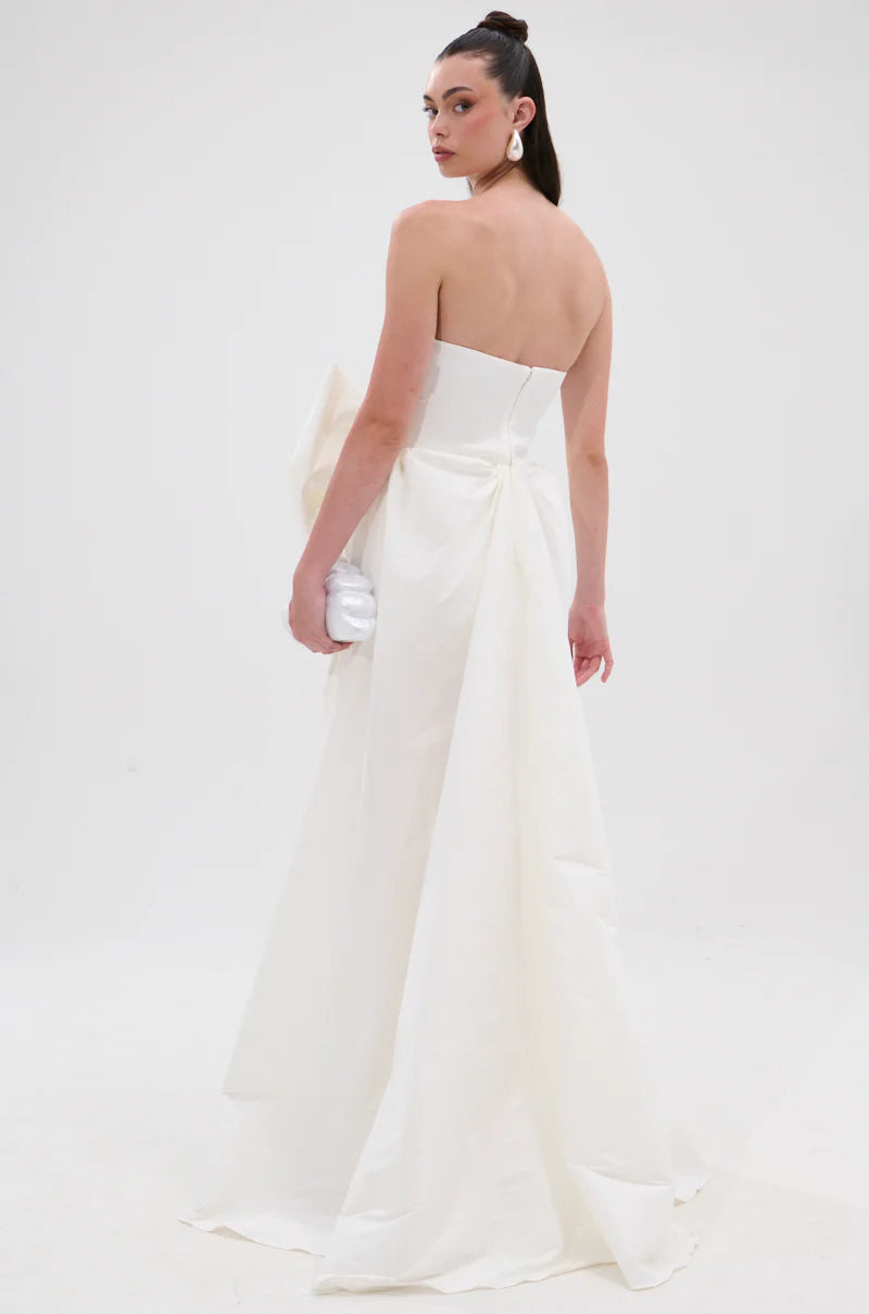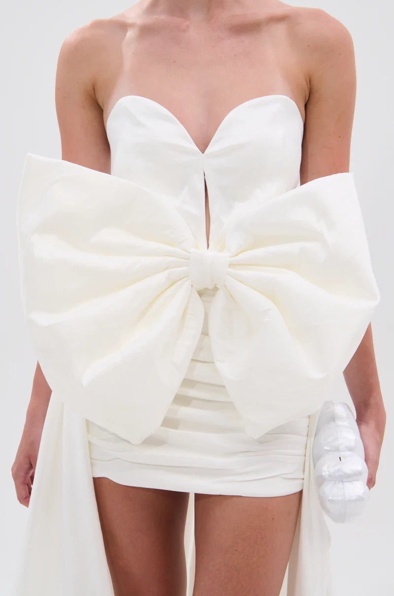 This mini dress stands out for its elegant train and large bow that adds a touch of sophistication and femininity. Its flattering design enhances the silhouette, making it ideal for special occasions where you want to stand out with a unique and refined style. Perfect for those seeking a balance between modernity and glamour.