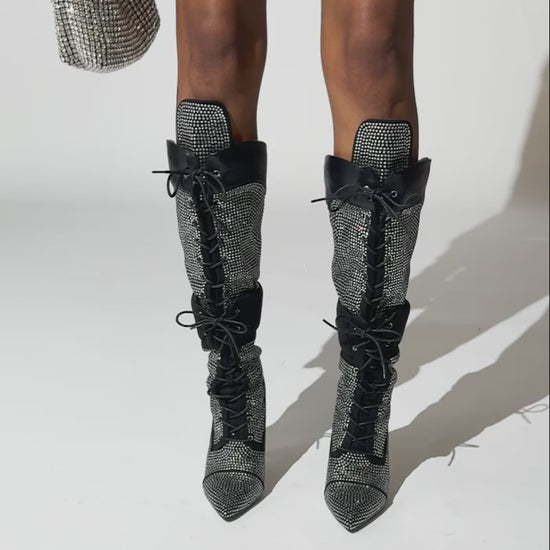 Luce espectacular esta temporada con las botas confeccionadas en suave ante sintético, estas botas altas hasta la rodilla presentan una elegante punta afilada, un tacón de aguja altísimo, cierre de cordones, detalles en piel sintética y un diseño fácil de poner. Además, están adornadas con brillantes pedrería plateada.