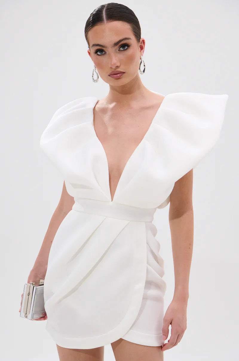 The white tulip hem ruffle sleeve mini dress features a knit fabric plunge neckline, short ruffle sleeves, and a mini wrap hem. It's finished with a cinched waist, pleat detailing at the front, a secure back strap, and a concealed back zip closure.